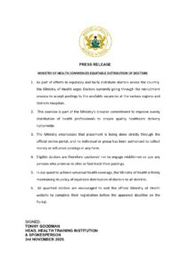 According to the Ministry, the new recruitment and posting process urges all newly qualified doctors to accept placements in available vacancies across regional and district hospitals, as part of a broader effort to ensure that every Ghanaian community benefits from quality healthcare services.