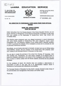The Ghana Education Service (GES) has taken administrative action by directing the Headmaster of Dzodze-Penyi SHS, Mr. Joshua Vidzro, to step aside while a full inquiry is carried out.