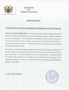 The statement further commended Qatar for its “tireless and impressive commitment” to mediating peace in the long-standing Israel-Palestine conflict. Ghana also appealed to the international community to ensure that the incident does not derail Qatar’s diplomatic efforts toward a peaceful resolution.