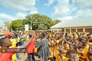 Led by the Vice-Chancellor, Registrar, and Alumni President, the ecstatic crowd waved flags, sang victory chants, and proudly displayed the world championship trophy that had placed Ghana on the global university football map.