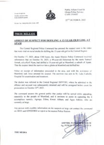 The Central Regional Police Command has arrested a 49-year-old fisherman, Samuel Armah, also known as Kofi Nyan, for allegedly defiling a 13-year-old girl at Mumford, a community near Apam.