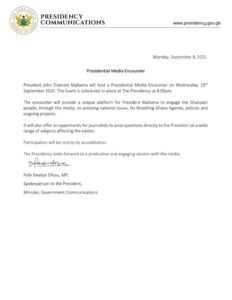 President John Mahama will on Wednesday, September 10, 2025, host a Presidential Media Encounter at The Presidency. The event, slated for 8:00 p.m., is expected to provide a platform for the President to address critical national issues while highlighting key elements of his Resetting Ghana Agenda, along with ongoing policies and projects.