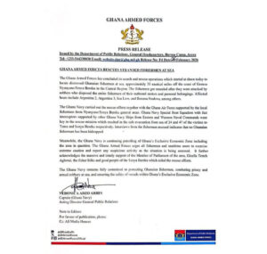 According to a press statement issued by the Department of Public Relations at General Headquarters, Burma Camp, the military successfully concluded a dawn search-and-rescue operation targeting distressed Ghanaian fishermen stranded approximately 35 nautical miles offshore near Nyanyano/Senya Beraku.